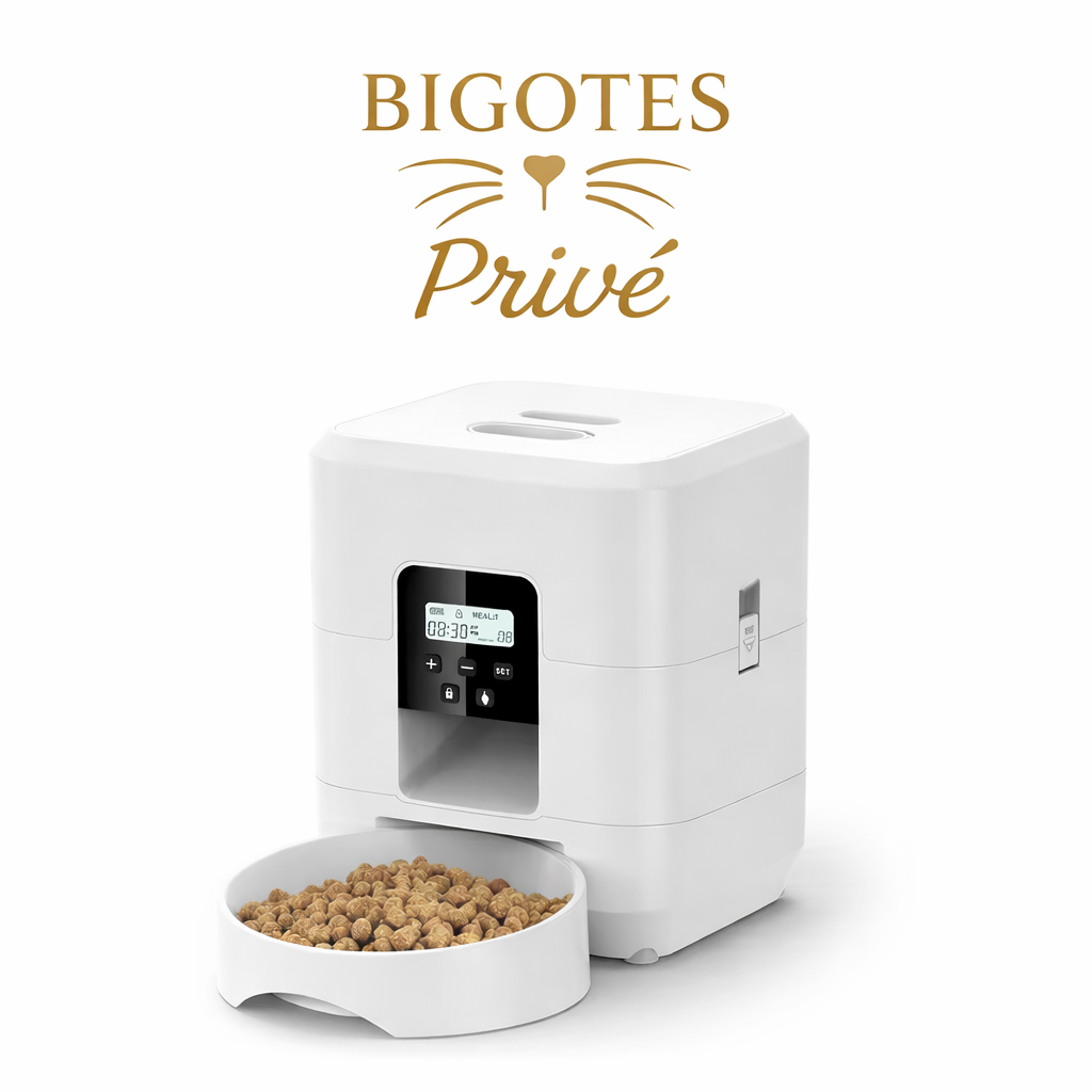 Con el nuevo dispensador automático de Bigotes Privé, tu gato come bien, a su hora y con estilo.
